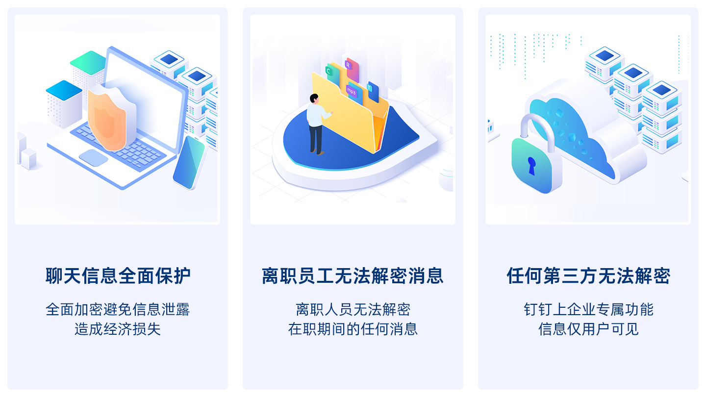 产品采用国密标准算法,让信息在传输、存储过程中都是加密状态,实现密钥、密文无法分离。除信息所有者外,任何第三方(包括钉钉)都无法查看,确保数据安全。